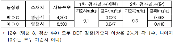 설명은 “경북도는 또한 상기 DDT 검출 2개 농장의 닭에 대해서는 23일부터 출하를 중지했다”고 밝혔다.