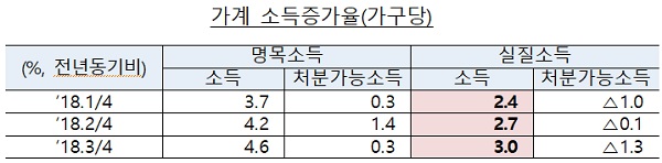 - 실질소득증가율(%,3분기): (’12)4.6 (’13)1.5 (’14)1.6 (’15)0.0 (’16)△0.1 (’17)△0.2 (’18)3.0