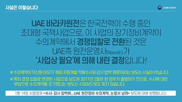 1월 14일 서울경제 <수사·감사 압박에…UAE원전 정비 수의계약, 눈앞서 날려>에 대한 해명입니다