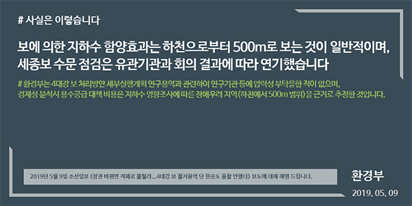 환경부는 “4대강 보 처리방안 세부실행계획 연구용역과 관련해 연구기관 등에 압력성 부탁을 넣은 적이 없으며 경제성 분석시 용수공급 대책 비용은 지하수 영향조사에 따른 장애우려 지역(하천에서 500m 범위)을 근거로 추정한 것”이라고 밝혔습니다. 또 “세종보 수문점검은 금강 수계 댐-보 등의 연계운영협의회의 결정에 따라 하반기에 점검하기로 했다”고 덧붙였습니다.