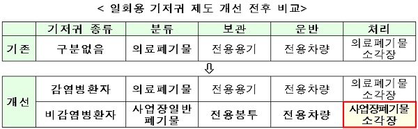 - ‘사업장일반폐기물’로 분류되는 기저귀를 배출, 운반할 때는 의료폐기물에 준하는 기준을 적용하고, 소각은 ‘의료폐기물 소각장’과 시설기준이 동일한 ‘사업장폐기물 소각장’에서 처리하게 할 계획임