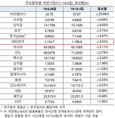 올해 하반기(7.1일~10.4일) 원화 절하율(△3.52%)은 주요 신흥국통화 중 아르헨 페소화(△25.96%), 브라질 헤알화(△6.49%), 남아공 랜드화(△6.43%), 호주 달러화(△3.74%), 中 위안화(△3.67%) 보다 작은 수준