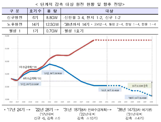 - 에너지전환(탈원전) 로드맵에 따라 원전은 ‘17년 24기에서 ‘22년 28기, ’31년 18기, ‘38년 14기 등으로 단계적으로 감축되며, 이러한 원전의 단계적 감축방안을 제8차 전력수급기본계획(~‘31년)과 제3차 에너지기본계획(~’38년)에 반영할 것입니다.