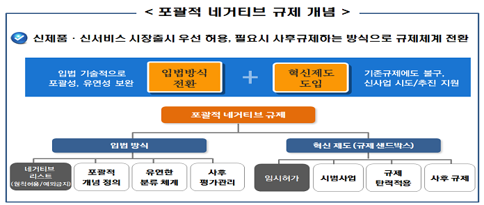 ㅇ 포괄적 네거티브 규제 전환은 첫째, 입법방식에 기존 네거티브 리스트 방식에 △포괄적 개념 정의, △유연한 분류체계, △사후평가·관리까지 추가하여 신제품·신기술이 신속하게 시장 출시가 가능하도록 하는 입법방식을 전환하는 방식과