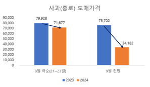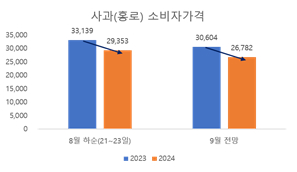 ** 사과(홍로) 소비자가격 : 8월 하순(21~23일) 29,353원/10개(전년 33,139원 대비 11.4%↓)