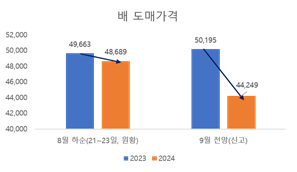 * 배 도매가격 : 8월 하순(21~23일, 원황) 48,689원/15kg(전년 49,663원 대비 2.0%↓)