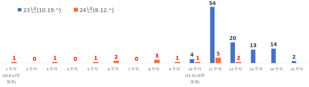 < 2023년 및 2024년 기간별 럼피스킨 발생추세 비교 > |