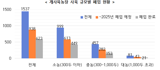 농장 규모별로 보면 상대적으로 폐업이 용이한 소농(300두 이하) 뿐만 아니라 중·대농에서도 조기 폐업에 적극 참여 중인 것으로 나타난다. 300두 초과 중·대농(538호)의 32.3%(174호)가 폐업을 완료했으며, 60.4%(325호)가 연내 폐업할 예정으로 개식용종식이 큰 차질 없이 이행될 것으로 보인다.