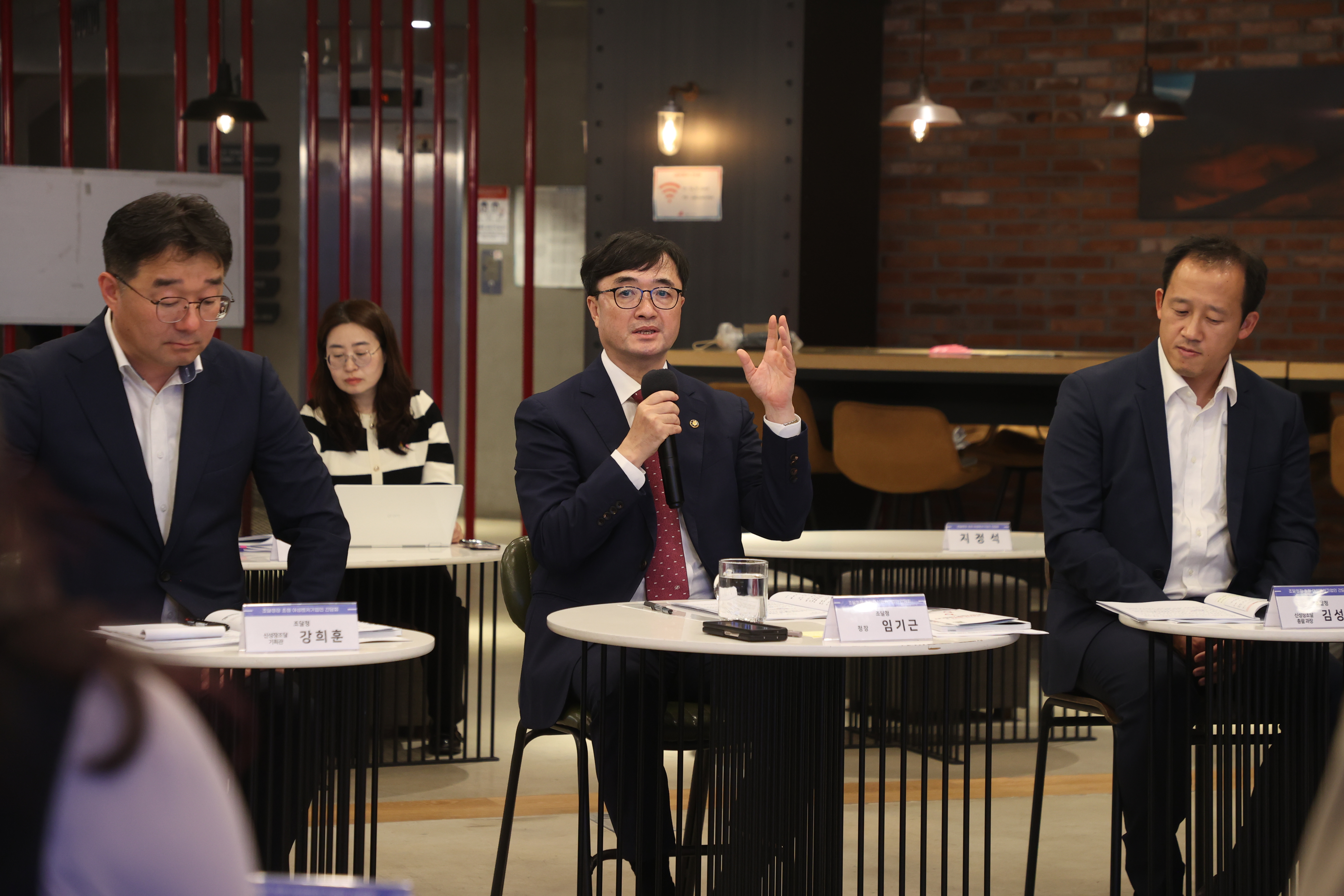▶임기근 조달청장(가운데)이 9일 서울 강남구 팁스타운 S6 세미나실에서 여성벤처·스타트업의 공공조달 참여 확대를 위한 '여성벤처기업 간담회'에서 인사말을 하고 있다.