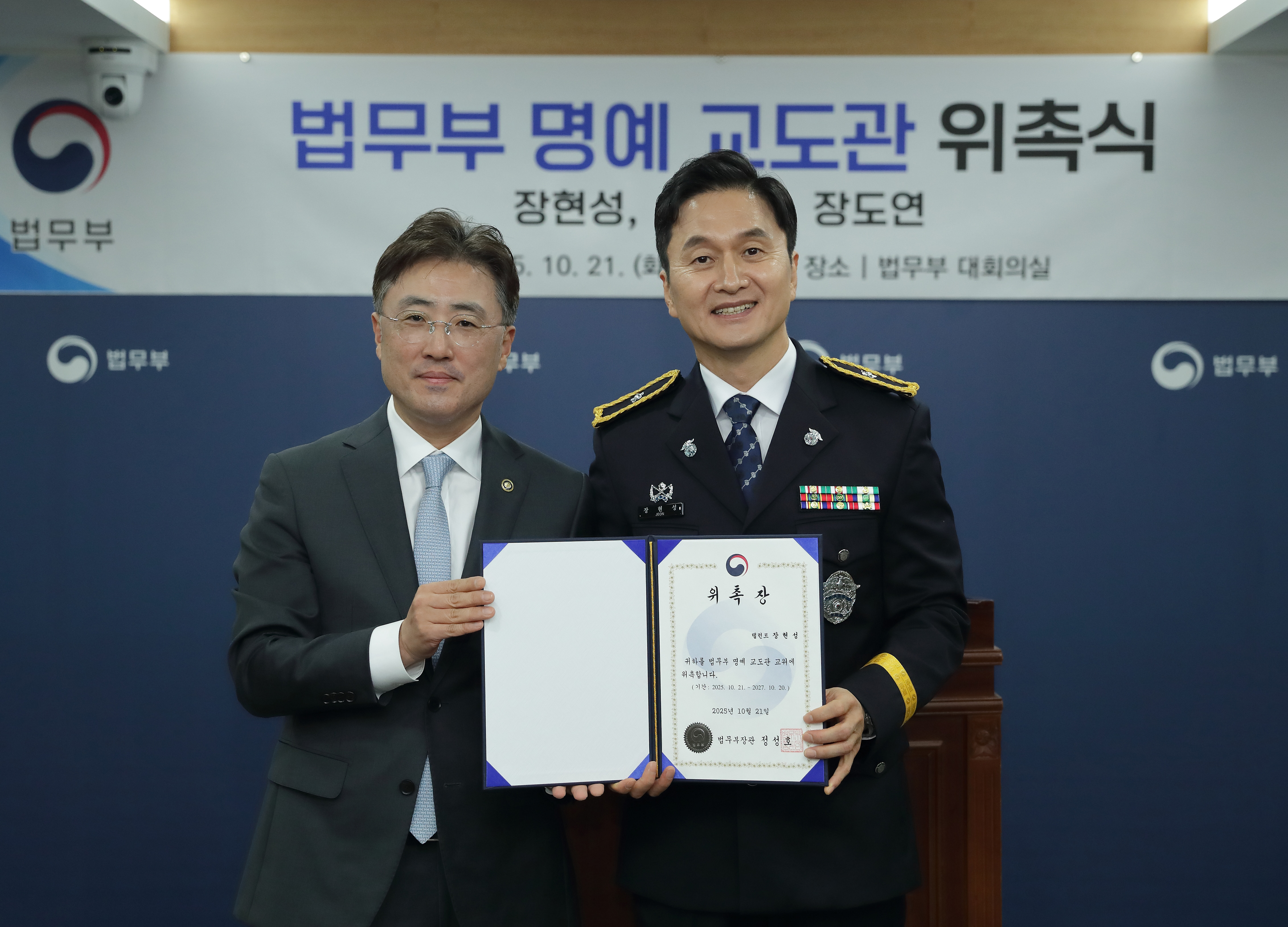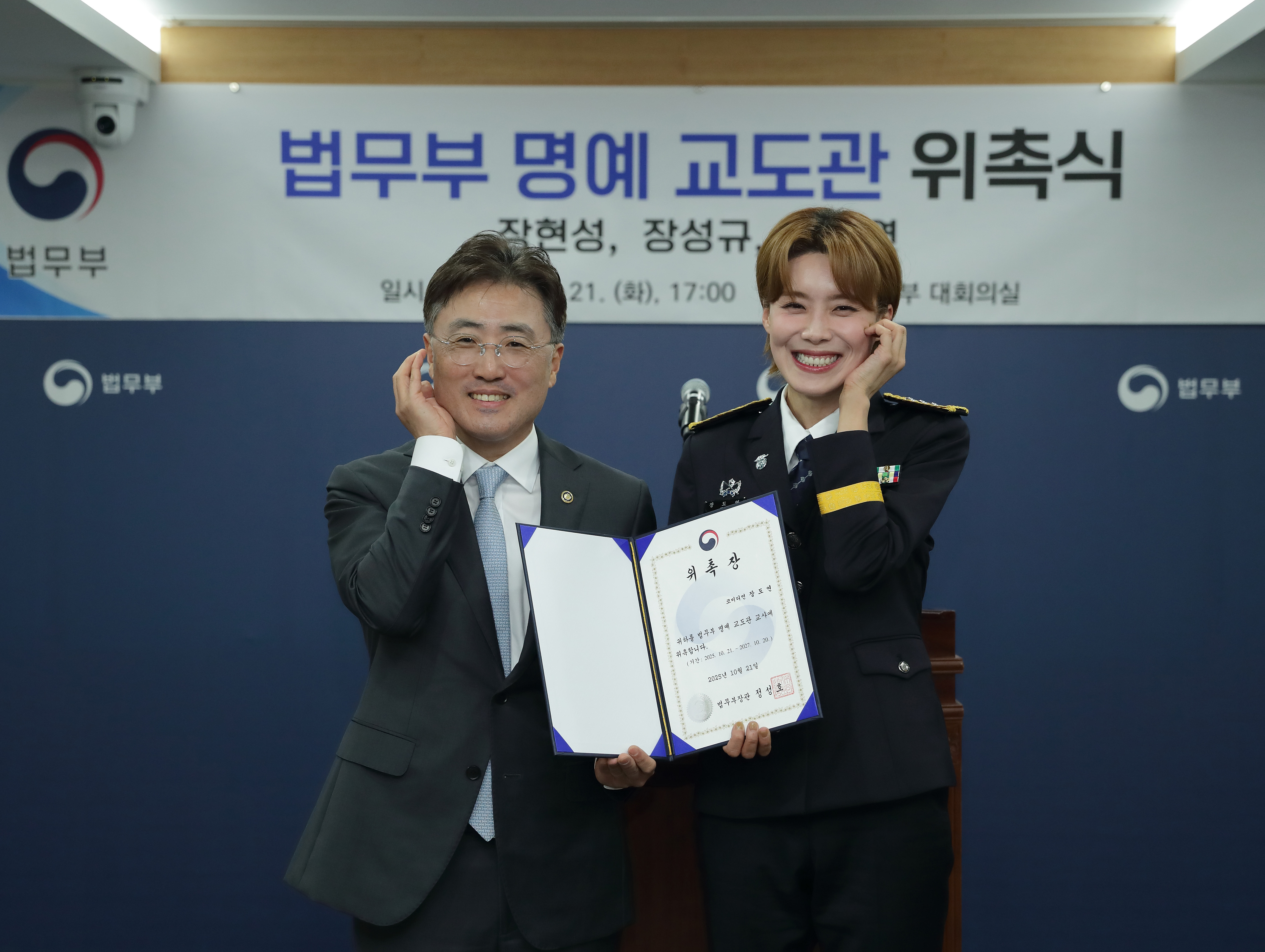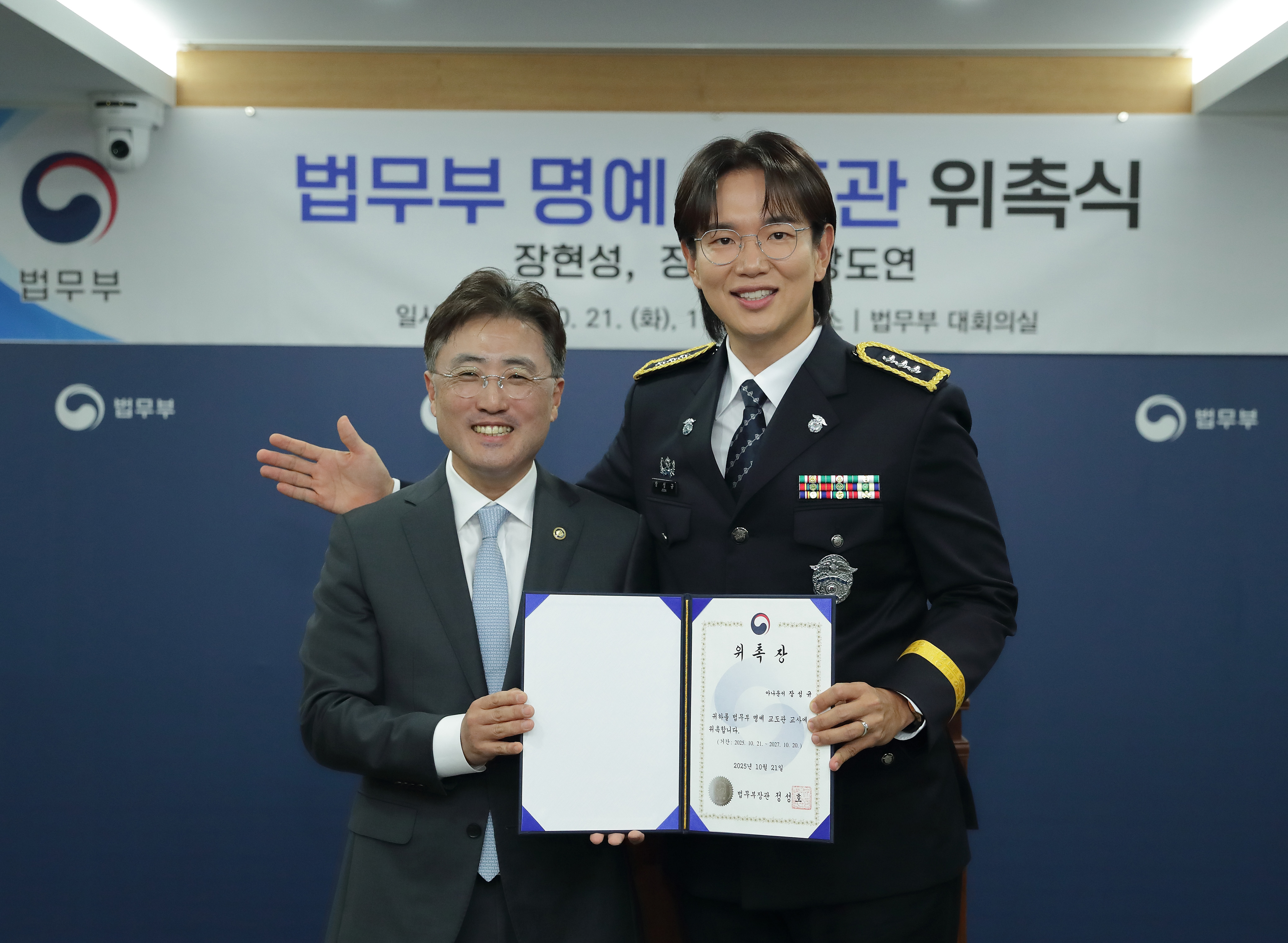 법무부(정성호 법무부장관)는 21일 오후 5시 30분 법무부 7층 대회의실에서 <꼬리에 꼬리를 무는 그날 이야기> 3명의 MC인 탤런트 장현성, 아나운서 장성규, 코미디언 장도연을 법무부 명예 교도관으로 위촉했다.