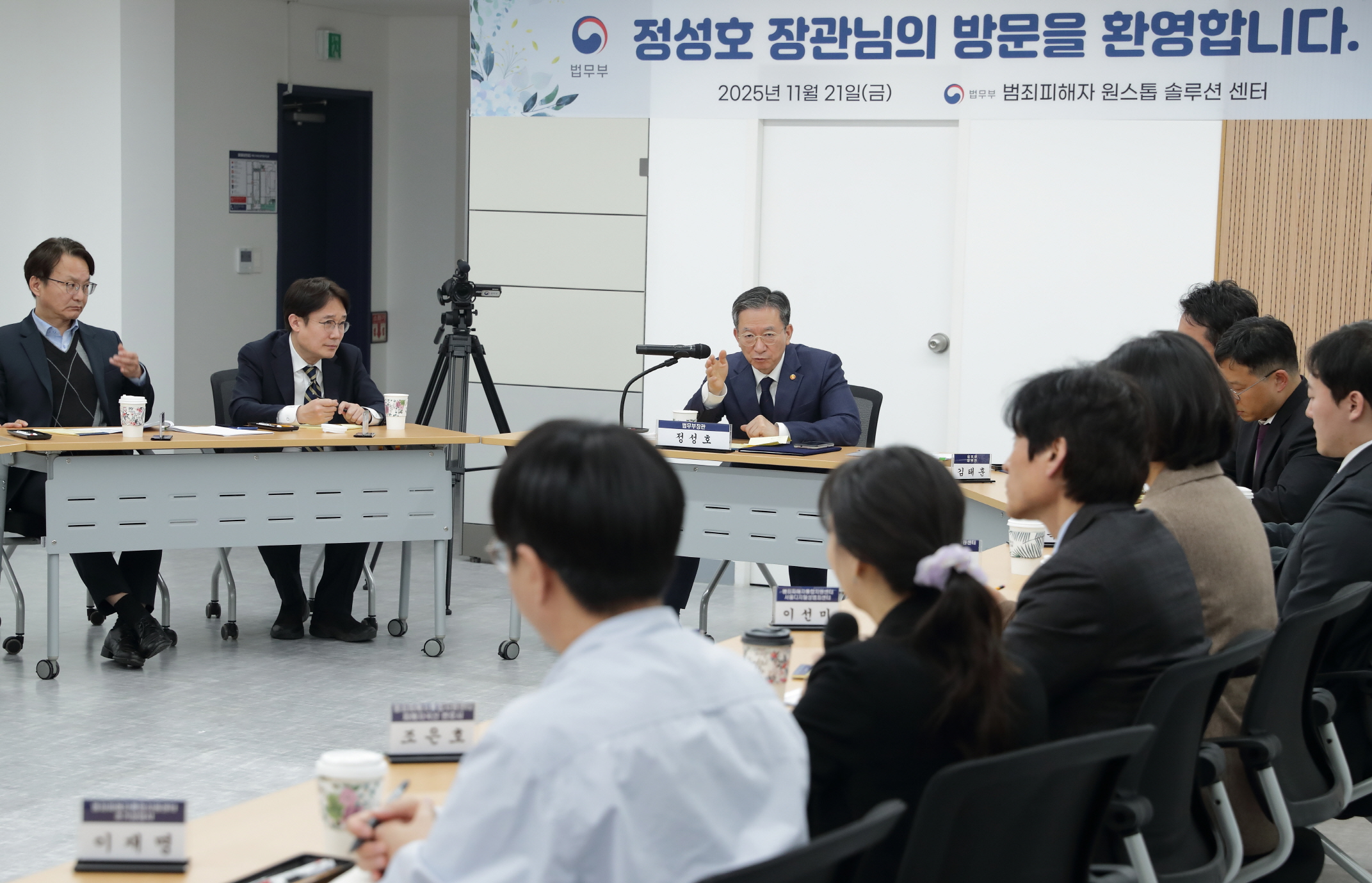 정성호 법무부 장관은 2025. 11. 21.(금) 16:00, 범죄피해자 원스톱 솔루션 센터에 방문하여 범죄피해자를 지원하는 일선 정책 현장을 점검하고, 직원들을 격려하였습니다.