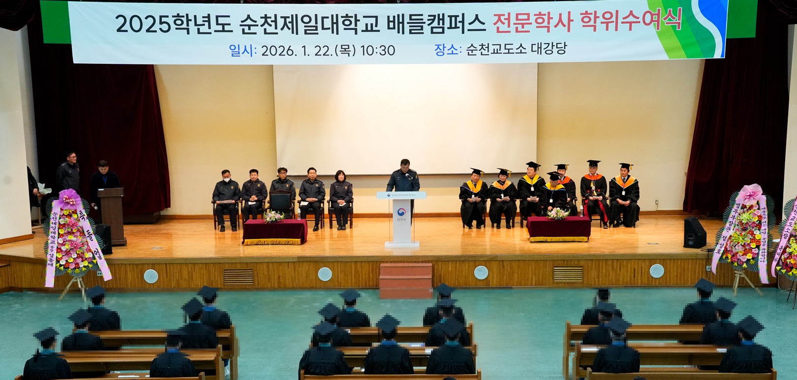 법무부(장관 정성호)는 1월 22일(목) 오전 순천교도소 대강당에서 순천제일대학교(총장 성동제)와 협력하여 운영 중인 '전문학사 위탁과정(커피바리스타&외식조리과)'학위수여식을 개최했다고 밝혔다.