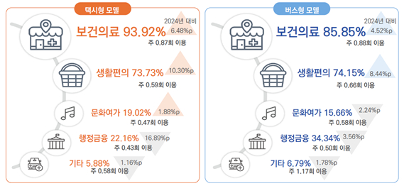 이번 조사 결과에 따르면, 택시형 이용자는 주로 병원, 약국 등 보건・의료시설 이용을 위한 단일 목적으로 교통모델을 이용하였고, 버스형은 보건・의료시설 외 장터, 마트, 관공서 등 여러 시설 방문을 목적으로 이용한 것으로 조사되었다. 또한, 버스형의 경우 주민이 원하는 시간에 원하는 곳으로 이동 가능한 콜버스 형태의 '수요응답형 버스'도 전년보다 증가한 17곳에서 운영되었다. 이는 단순히 운행 규모를 확대하는 것에 그치지 않고, 주민들의 실제 생활 동선과 수요에 맞춘 서비스 내실화에 집중한 결과로 분석된다.