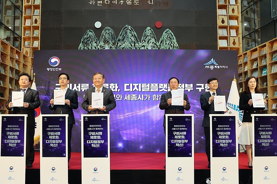- 이상민 행정안전부 장관(왼쪽 세 번째)이 28일 세종특별자치시청에서 열린 ‘구비서류 제로화, 디지털플랫폼정부 구현’ 행사에서 최민호 세종특별자치시장 등 관계자들과 퍼포먼스를 하고 있다.