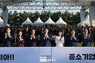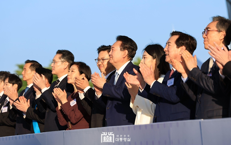 - 윤석열 대통령이 23일 서울 용산 대통령실 잔디마당에서 열린 ‘2024 대한민국 중소기업인대회’에서 참석자들과 기념 촬영을 하고 있다.