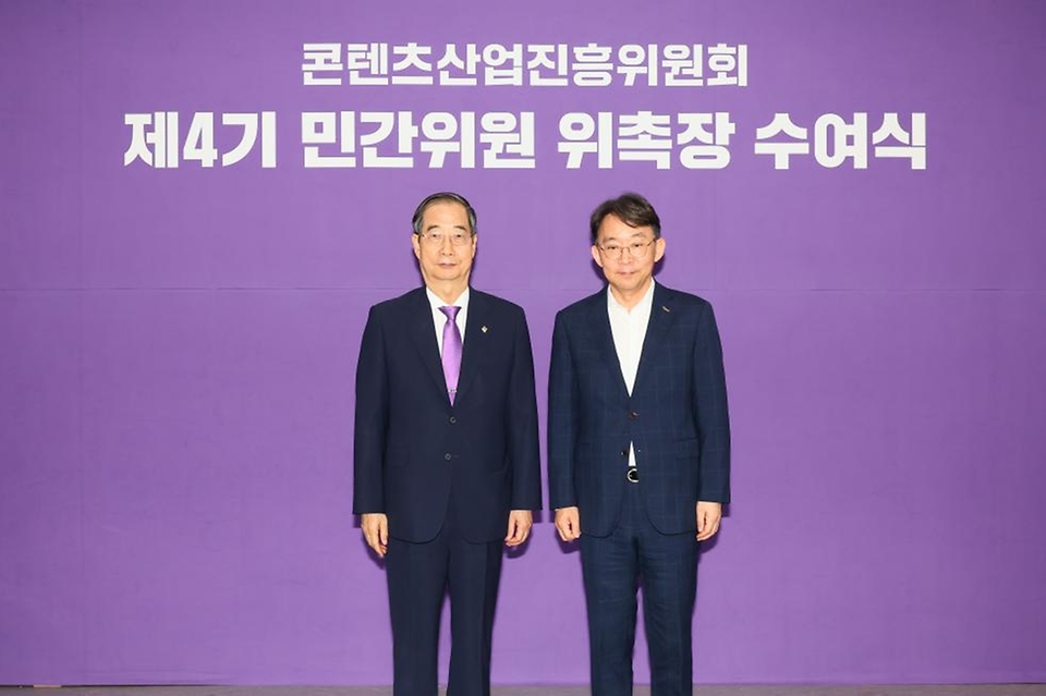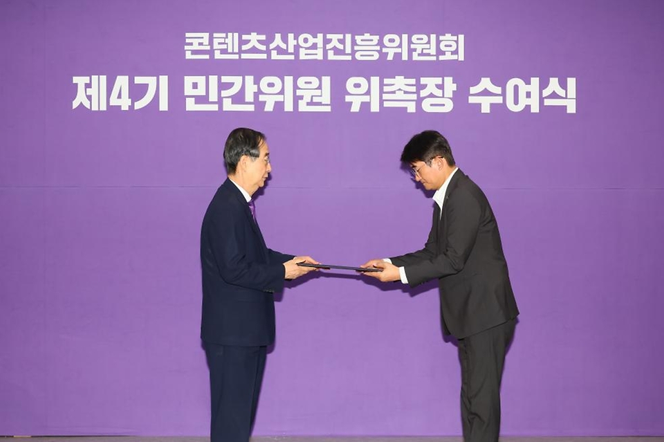 - 한덕수 국무총리가 18일 경기도 성남시 경기기업성장센터에서 열린 콘텐츠산업진흥위원회 제4기 민간위원 위촉장 수여식에서 위원들과 기념 촬영을 하고 있다. (왼쪽부터 유인촌 문화체육관광부 장관, 안제현 삼화네트웍스 대표, 김성태 IBK기업은행장, 성미영 인천대학교 컴퓨터공학부 교수, 한덕수 국무총리, 박상규 중앙대학교 총장, 박민 KBS 사장, 윤상현 CJ ENM 대표)