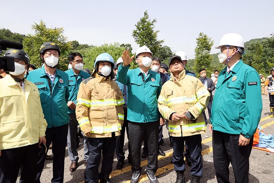 - 이상민 행정안전부 장관이 24일 경기 화성시 서신면 소재 일차전지 제조 업체 공장 화재 현장을 찾아 화재진압 상황 등을 점검하고 있다.