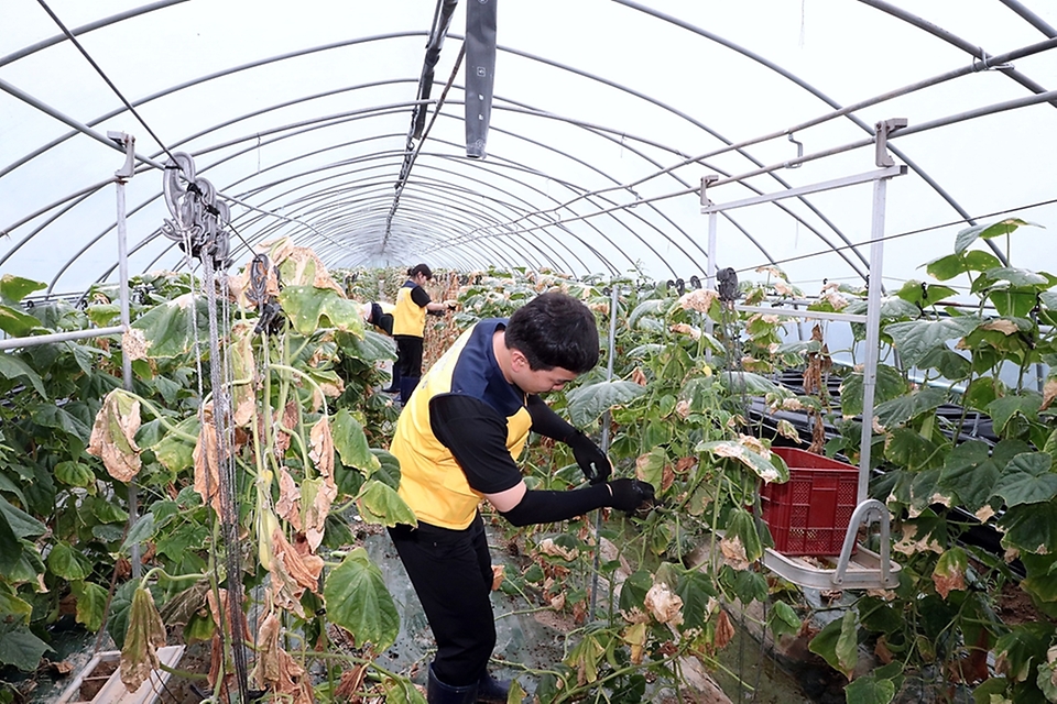 - 행정안전부 직원 및 경찰 직장협의회 직원들이 23일 충남 부여군의 한 오이 농가를 찾아 수해복구 봉사활동을 하고 있다.
