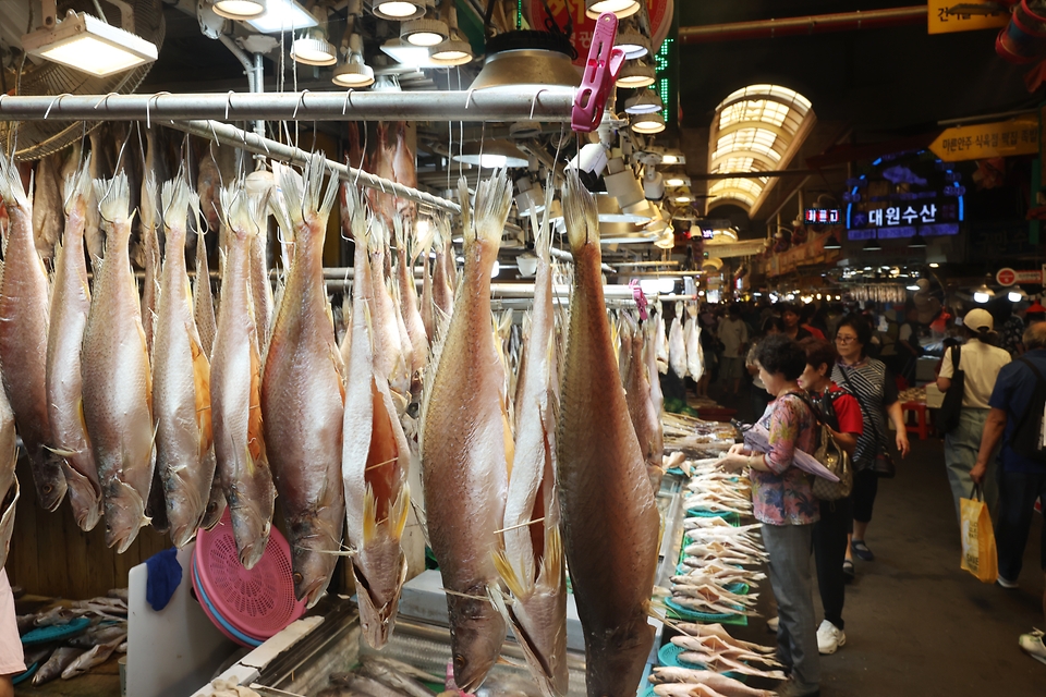 - 추석 연휴를 2주일 앞둔 가운데 1일 부산 부산진구 부전시장을 찾은 시민들이 제수용품을 구입하고 있다. 정부는 본격적인 추석 성수기에 배추, 무, 사과, 배, 양파, 마늘, 감자 등 농산물과 소, 돼지, 닭고기, 계란 등 축산물 등 추석 성수품을 15만3000t 공급을 역대 최대 규모로 늘리고, 할인 지원을 강화한다.