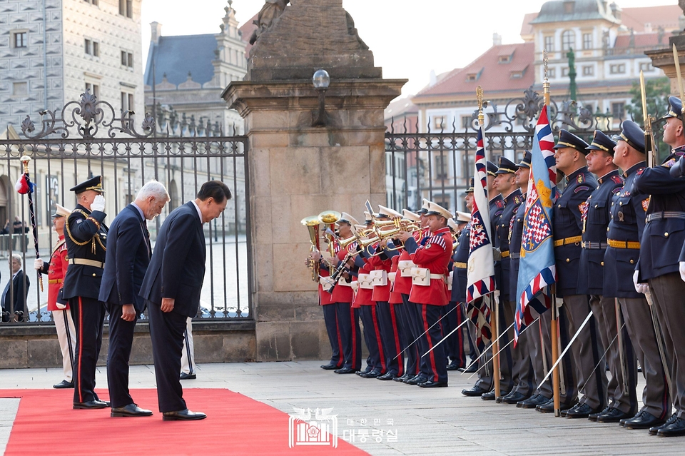 - 윤석열 대통령과 김건희 여사가 19일(현지시간) 체코 프라하성 제1광장에서 열린 공식환영식에 페트르 파벨(Petr Pavel) 체코 대통령 부부와 참석, 애국가가 연주되자 국기에 경례하고 있다.