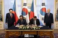 - 윤석열 대통령과 페트르 파벨(Petr Pavel) 체코 대통령이 19일(현지시간) 체코 프라하성에서 열린 한·체코 간 우크라이나 재건 관련 개발 협력과 인도적 지원 등 분야 MOU 체결식에서 조태열 외교부 장관과 얀 리파브스키(Jan Lipavsky) 체코 외교장관이 서명식을 진행하는 동안 임석하고 있다.