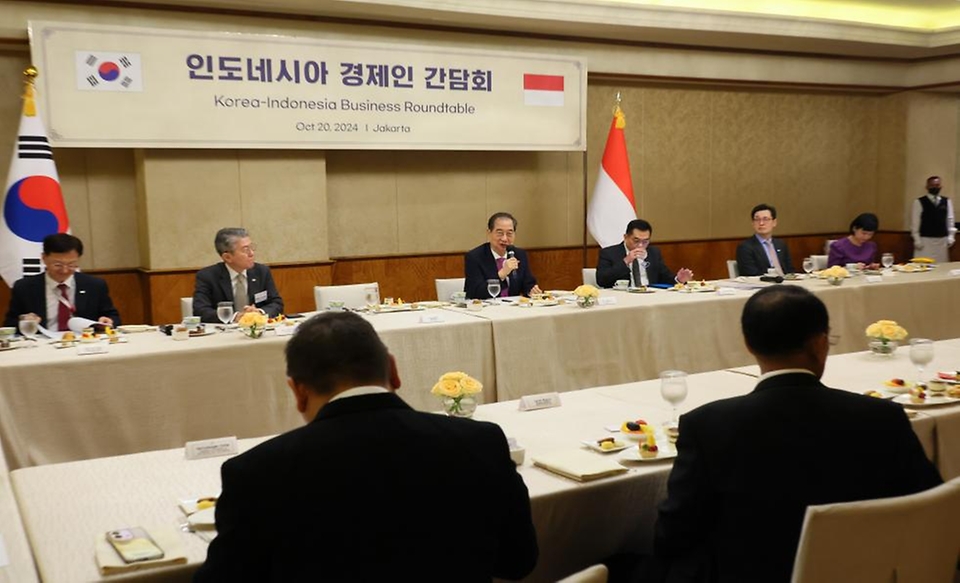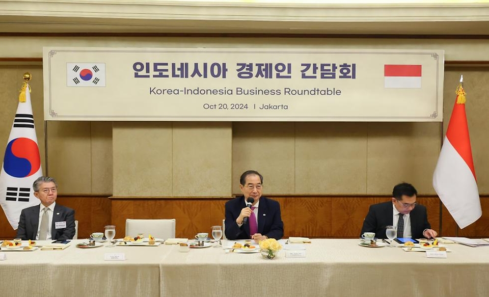 - 한덕수 국무총리가 20일(현지시간) 자카르타 물리아 세나얀 호텔에서 인도네시아 경제인 간담회에 참석, 인사말을 하고 있다.
