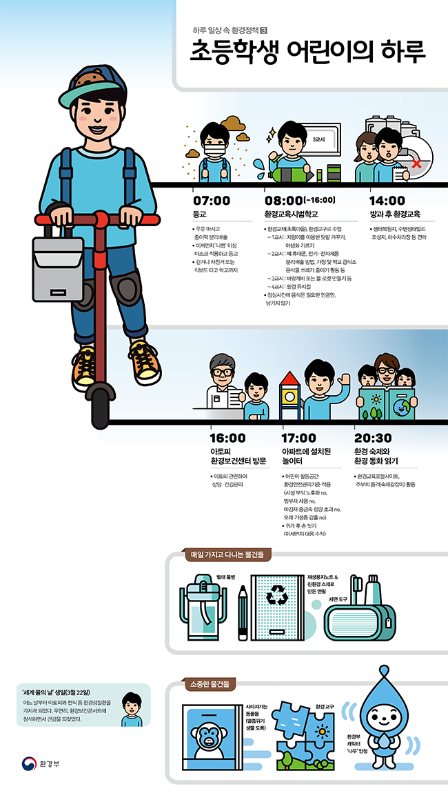 일상 속에서 지켜야할 환경정책은 무엇이 있을까요? 초등학생 어린이의 하루로 돌아보는 우리 일상 속 환경정책을 인포그래픽으로 알아볼게요.