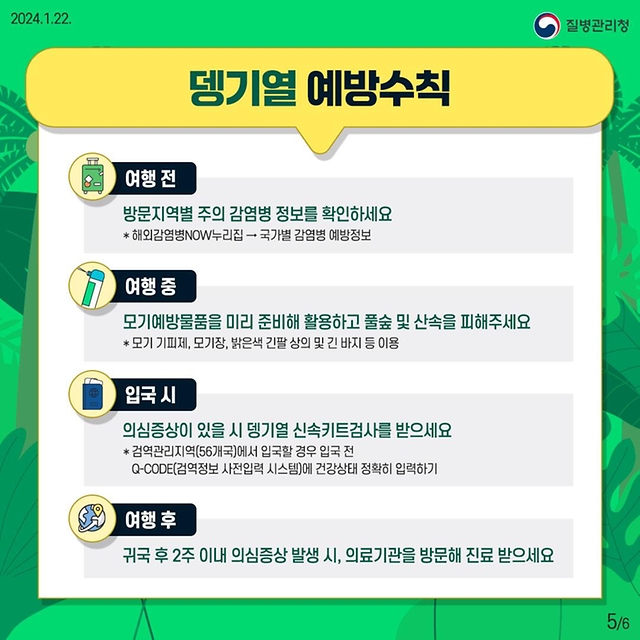 해외 방문 후 뎅기열 의심증상(발열, 두통, 근육통·발진 등) 발생 시 검역소에 무료 뎅기열 신속키트검사 실시