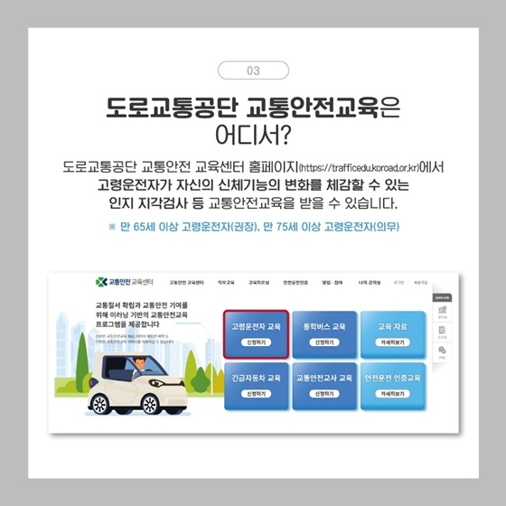 도로교통공단 교통안전 교육센터 홈페이지에서 고령운전자가 자신의 신체기능의 변화를 체감할 수 있는 인지 지각검사 등 교통안전교육을 받을 수 있습니다.