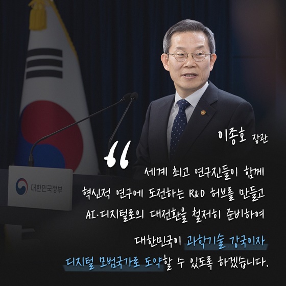 과기정통부는 세계 최고 연구진들이 함께 혁신적 연구에 도전하는 R&D 허브를 만들고, AI·디지털로의 대전환을 철저히 준비하여, 대한민국이 과학기술 강국이자 디지털 모범국가로 도약할 수 있도록 하겠습니다.