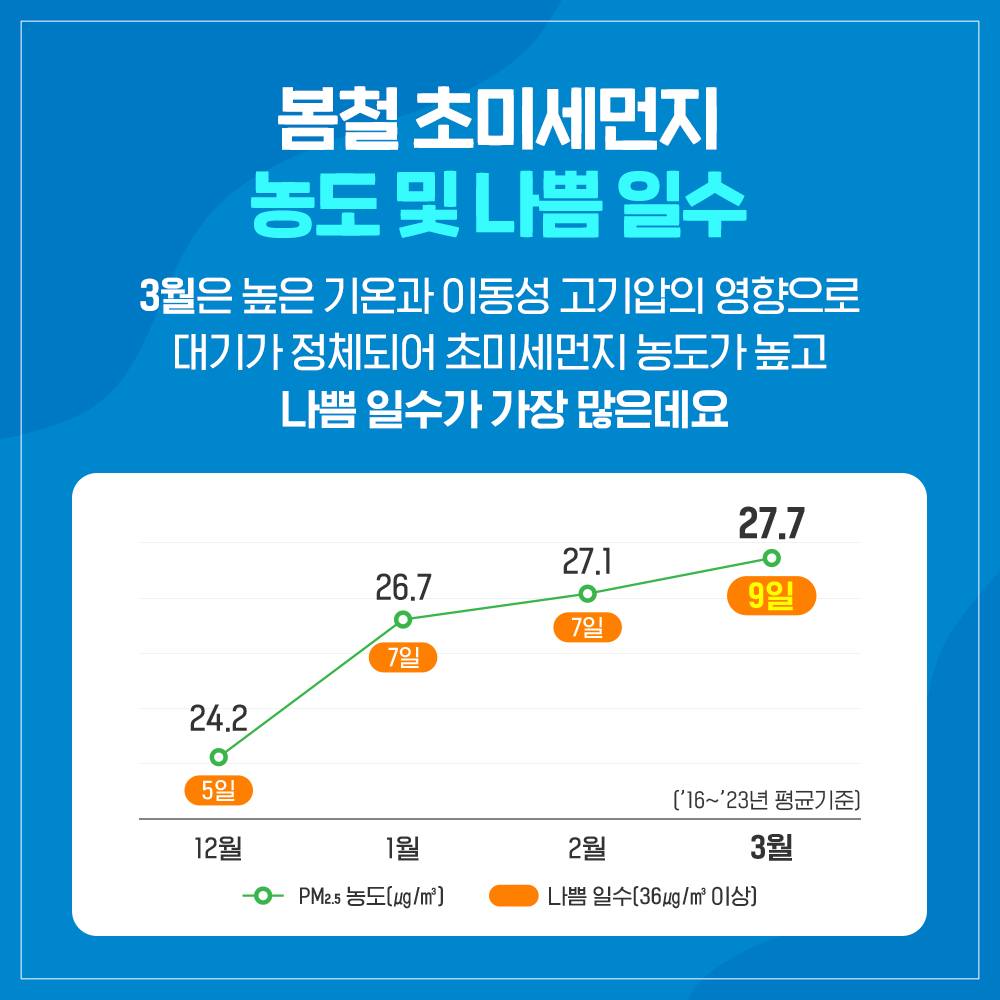 3월은 높은 기온과 이동성 고기압의 영향으로 대기가 정체되어 초미세먼지 농도가 높고 나쁨 일수가 가장 많은데요.