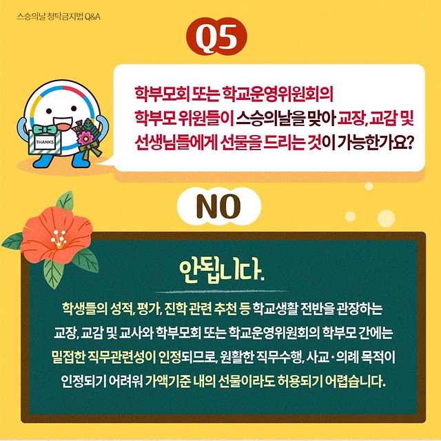 Q. 학부모회 또는 학교운영위원회의 학부모 위원들이 스승의 날을 맞아 교장, 교감 및 선생님들에게 선물을 드리는 것이 가능한가요?