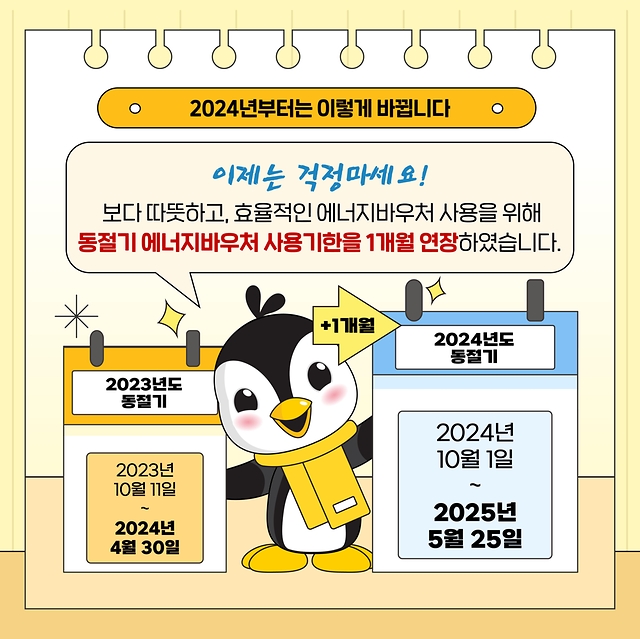 이제는 걱정마세요! 보다 따뜻하고, 효율적인 에너지바우처 사용을 위해 동절기 에너지바우처 사용기한을 1개월 연장하였습니다.