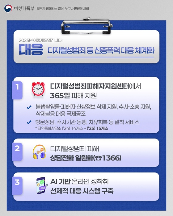 2025년 여성가족부는 디지털성범죄, 스토킹, 교제폭력 등 신종 폭력 피해 대응을 강화해 안전한 일상을 만들어 나가겠습니다.