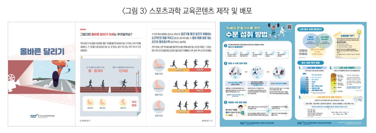 또한 스포츠과학 정보를 압축하여 담은 리플렛이나 카드뉴스 형태의 교육콘텐츠를 제작하여 배포하고 있다. 특별한 설명 없이도 전공지식이 없는 성장기 선수나 부모님이 이해하기 쉽도록 구체적이지만 직관적인 형태로 제작하고 있으며, 인쇄물이나 카카오톡채널, 인스타그램과 같은 각종 누리소통망(SNS)을 활용하여 지속적으로 배포하고 있다. 그리고 한국스포츠정책과학원 누리집(홈페이지)에 차세대팀 정보페이지를 개설하여 정보를 공유 받을 수 있도록 하였다.