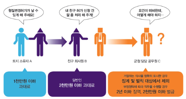 ● 반면, 담당 공무원 C가 부정청탁자 B의 부정청탁에 따라 토지형질변경허가를 내 준 경우 형사처벌 대상(2년 이하의 징역 또는 2천만원 이하의 벌금)