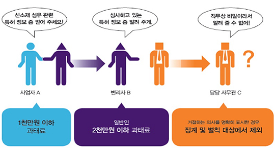 ● 사업자 A는 제3자인 변리사 B를 통하여 부정청탁을 하였으므로 1천만원 이하의 과태료 부과 대상