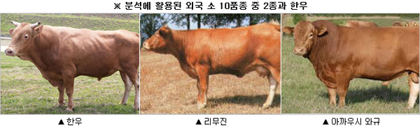 국립축산과학원은 한우와 외모가 비슷한 외국 소 가운데 국내 유통 중인 수입 소를 포함한 총 10품종 264마리 5만 4609개 염기서열변이정보를 수집해 유전체를 분석했다.