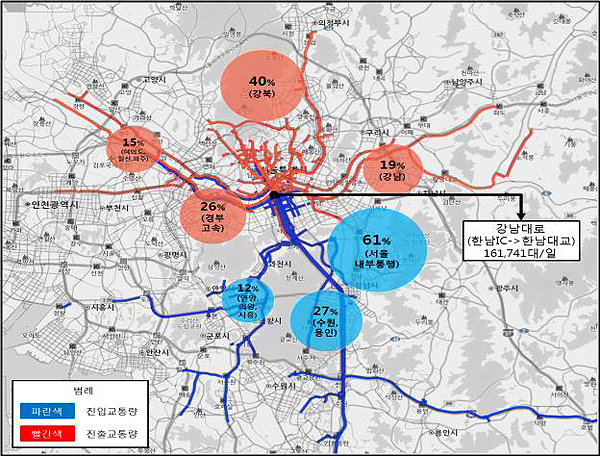 우리나라에서 교통량이 가장 많은 도로는 하루 평균 16만 1741대의 교통량이 발생하는 강남대로(한남IC→한남대교)인 것으로 나타났다.