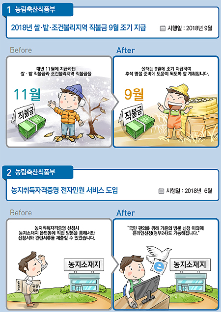 ▲2018년 쌀·밭·조건불리지역 직불금 9월 조기 지급 매년 11월에 지급하던 쌀·밭 직불금과 조건불리지역 직불금을 올해는 농업인의 자금수요가 많은 9월에 조기 지급해 추석 명절준비에 도움이 되도록 할 계획이다.