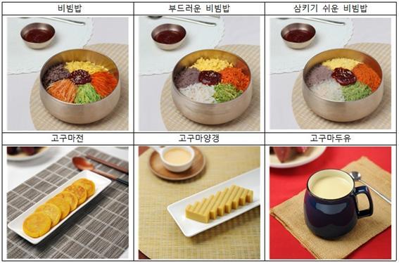 이번에 선보인 비빔밥과 고구마 간식은 고령자의 치아 상태에 따라 씹는 능력을 고려해서 단계별로 조리할 수 있도록 했다.