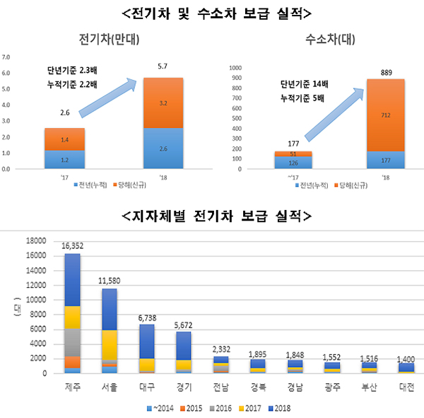 지방자치단체별 2018년 전기차 보급대수는 제주가 약 7000대로 가장 많고, 이어 서울 5600대, 대구 4700대, 경기 3700대, 경북 1200대 순이다.