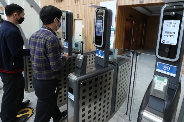 지난 11일부터 서울·세종·과천·대전 등 전국 4곳 정부청사 입구에 있는 스피드게이트의 안면인식시스템 운영이 중단됐다. 기존에는 청사 출입을 위해 스피드게이트를 통과하려면 마스크를 벗어야 했으나 당분간은 쓴 채로 출입이 가능하다. 얼굴 인식을 위해 마스크를 벗었을 때 코로나19 바이러스가 전파할 가능성을 차단하겠다는 것이다. 시스템 운영중단은 감염병 위기경보 ‘심각’ 단계 해지 시까지 계속된다.