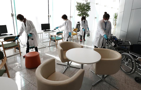 정부청사관리본부 방역관계자들이 정부세종청사 종합안내소 방역 작업을 진행하고 있다. 청사 방역 작업은 코로나19가 종식될 때까지 수시로, 꾸준히 실시할 계획이다.