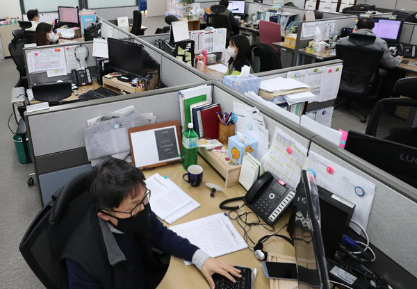 사무실의 모습도 조금 달라졌다. 한 개인이 다른 개인을 감염시키지 않을 거리. 즉, ‘사회적 거리두기’는 근무 중에도 이어진다. 공무원들은 근무시간에도 마스크를 쓰고 대국민 업무에 지장이 없는 범위에서 교대로 재택근무를 실시하기로 했다. 이와 관련해 인사혁신처는 12일 ‘코로나19 확산 차단을 위한 공무원 대상 유연근무 이행지침’을 중앙행정기관 50여곳에 전달했다.
