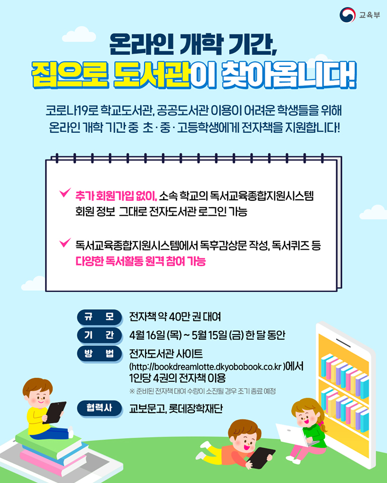 코로나19로 학교도서관, 공공도서관 이용이 어려운 학생들을 위해 온라인 개학 기간 중 초·중·고등학생에게 전자책을 지원합니다!