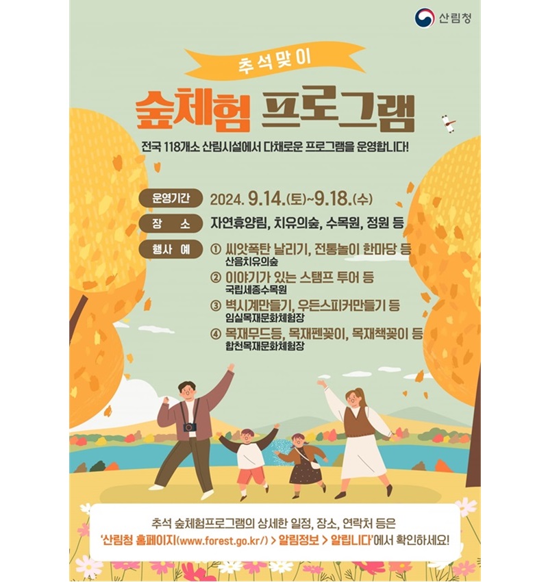 추석명절 숲체험 프로그램 관련 자세한 내용은 산림청 누리집(www.forest.go.kr)에서 확인할 수 있다.