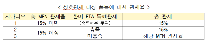 미국 MFN 관세율이 15% 이상인 품목도 한미 FTA를 충족하는 경우 총 15% 관세만 부과한다.