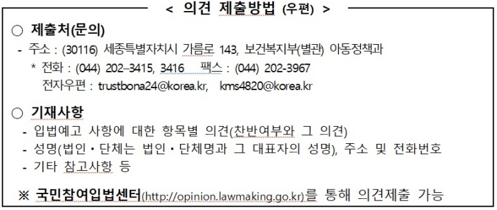 복지부는 입법예고 동안 의견을 폭넓게 수렴한 뒤 개정안을 확정하고, 관련 의견은 다음 달 25일까지 복지부 아동정책과 또는 국민참여입법센터로 제출하면 된다.