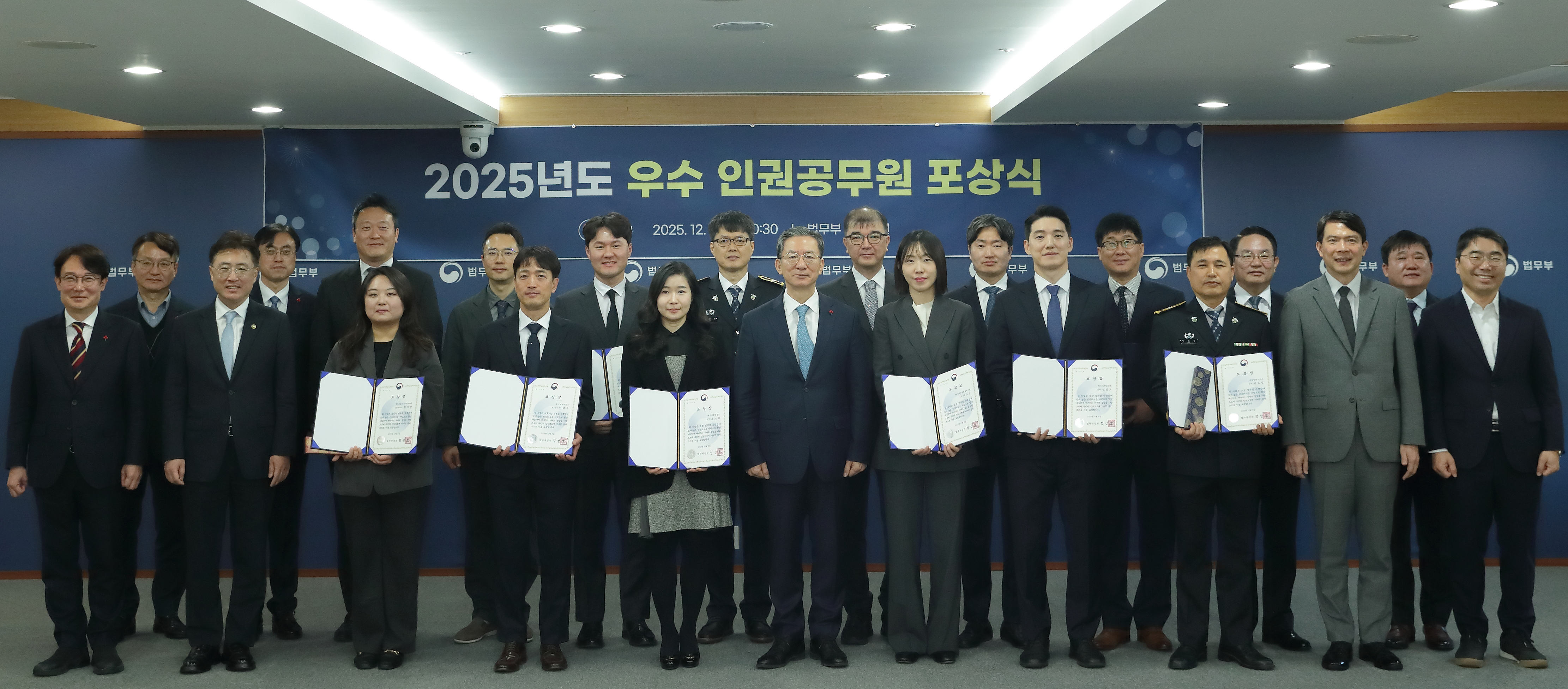 법무부(장관 정성호)는 2025. 12. 8.(월) 세계 인권의 날(12. 10.)을 기념하여 2025년 한 해 법무행정 일선에서 인권 보호를 위해 남다른 노력을 한 검사 3명, 검찰수사관 3명, 교정공무원 4명, 출입국관리공무원 2명, 보호직공무원 2명 등 총 14명을 「2025년도 우수 인권공무원」으로 선정·표창하였다.
